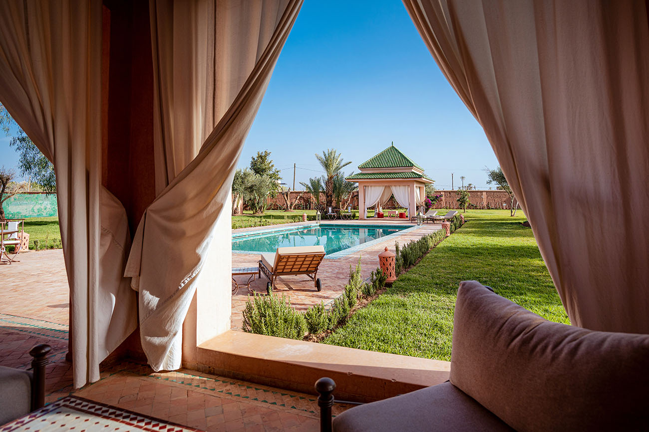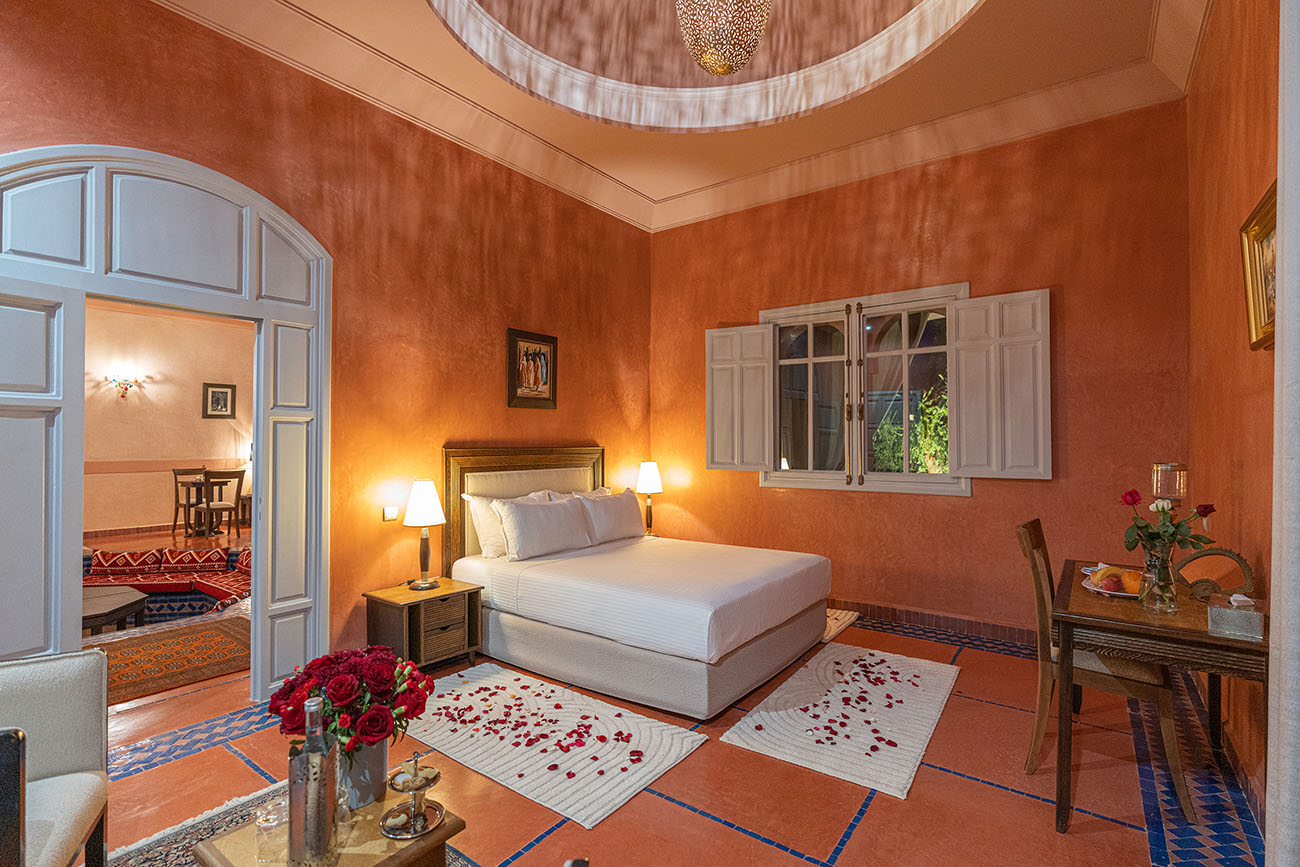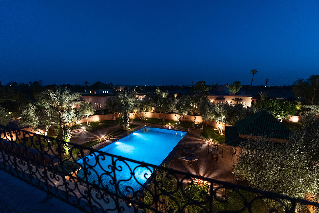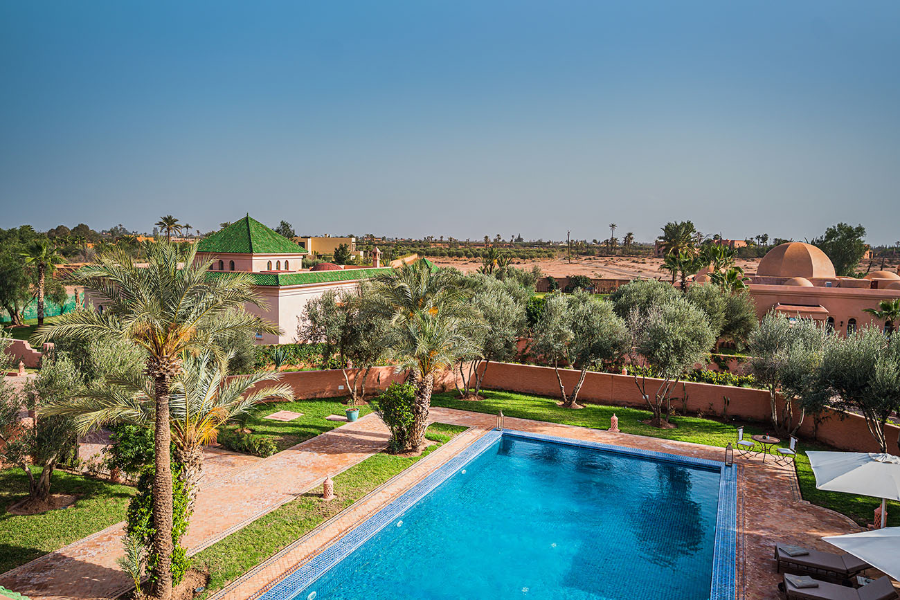 Palais Alcazar is a luxurious touristic residence with a total superficy of 1Ha, located in the prestigious Bab Atlas area of Marrakech, nestled between the palm forest and the hills of Jbilets, with the majestic Atlas mountains as a background.