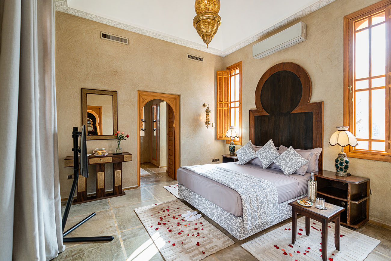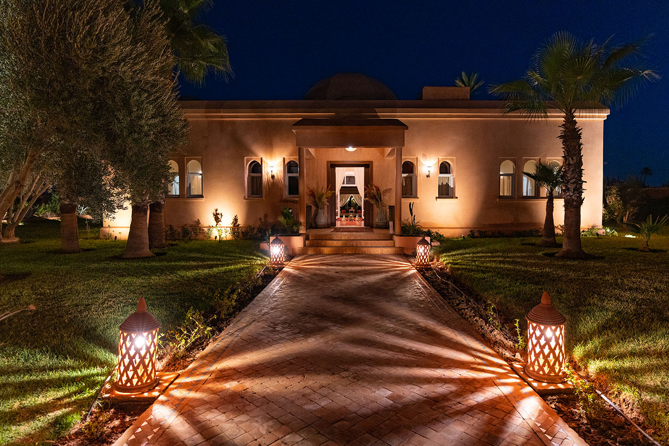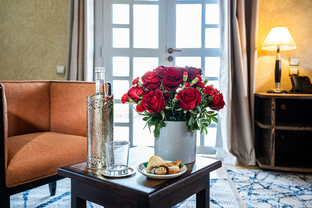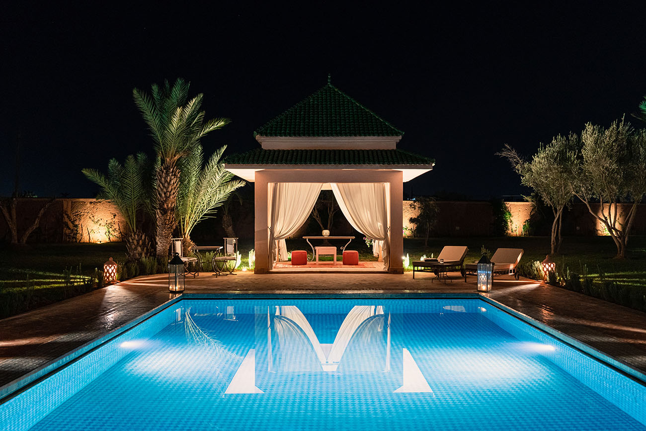 Palais Alcazar is a luxurious touristic residence with a total superficy of 1Ha, located in the prestigious Bab Atlas area of Marrakech, nestled between the palm forest and the hills of Jbilets, with the majestic Atlas mountains as a background.