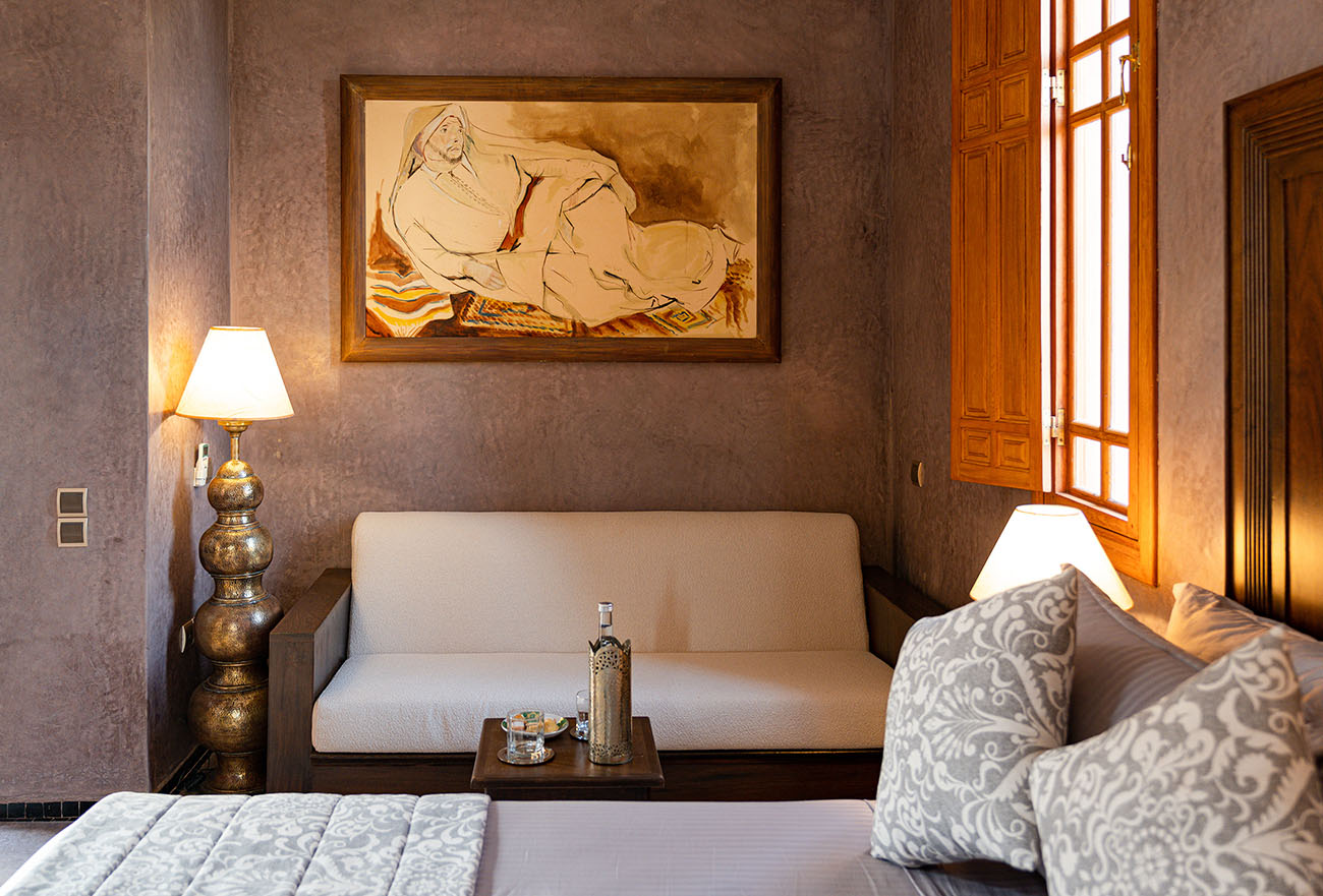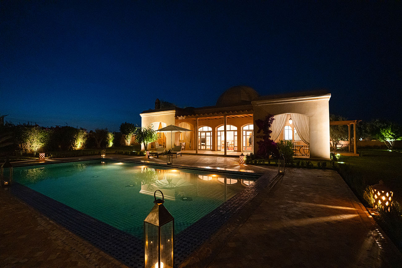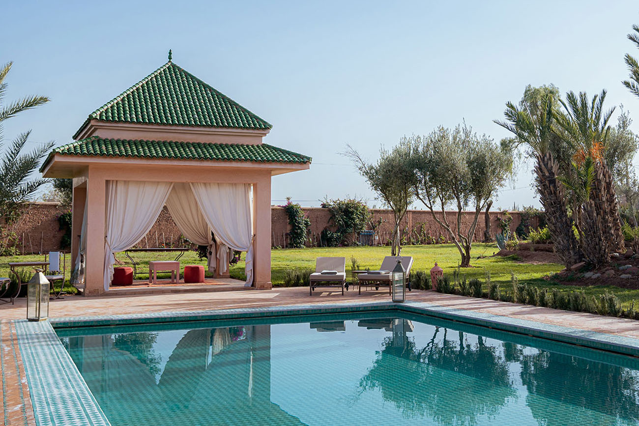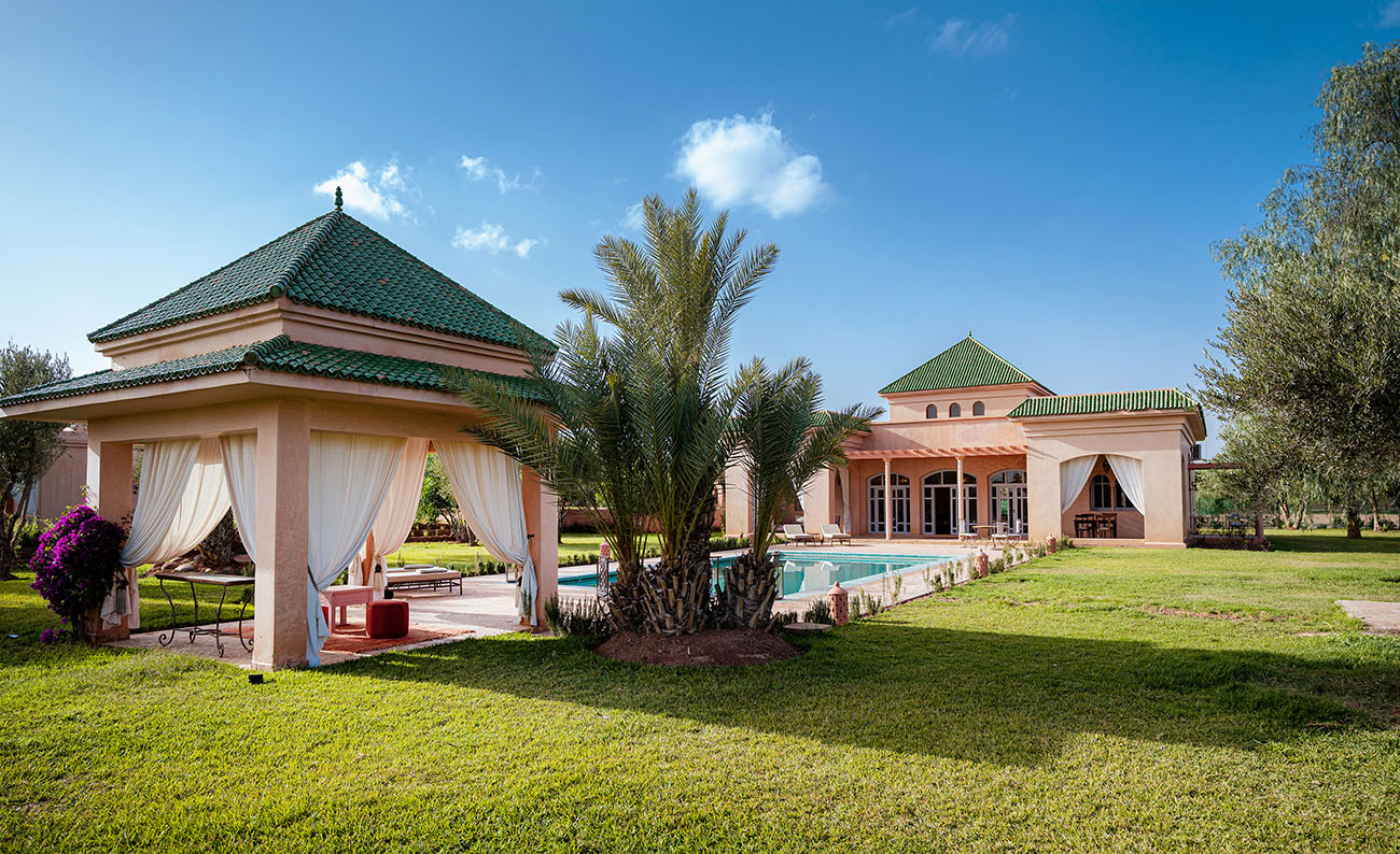 Palais Alcazar is a luxurious touristic residence with a total superficy of 1Ha, located in the prestigious Bab Atlas area of Marrakech, nestled between the palm forest and the hills of Jbilets, with the majestic Atlas mountains as a background.